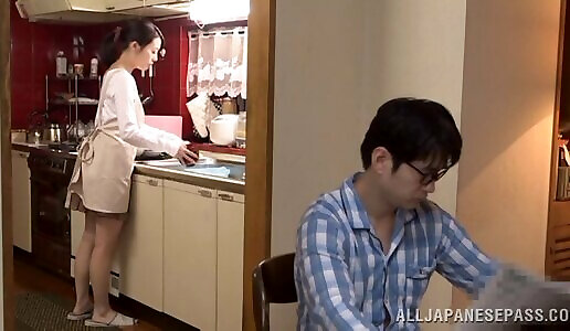 युवा गृहिणी लिसा युवा है उसे गधे के साथ आकर्षक गहरा घाव रसोई घर में